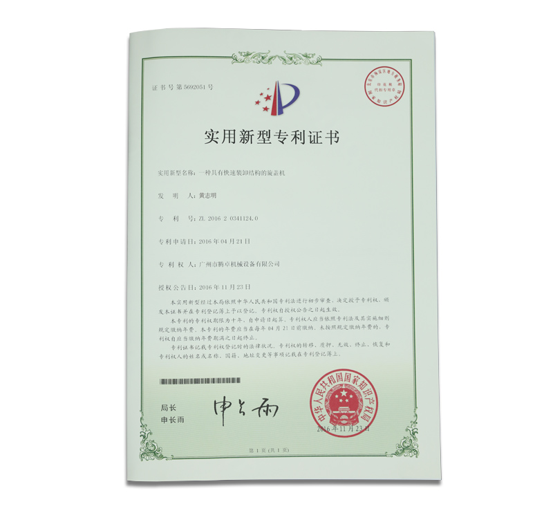 騰卓機(jī)械專利生產(chǎn)證書,專業(yè)制造包裝設(shè)備的生產(chǎn)廠家,全自動及半自動的洗瓶機(jī),烘干機(jī),灌裝機(jī),旋蓋機(jī),貼標(biāo)機(jī),套標(biāo)機(jī),打碼機(jī)等非標(biāo)定制自動化包裝生產(chǎn)線