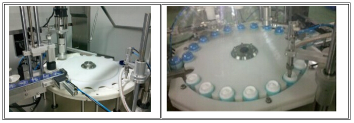 本機(jī)主要用于日化的灌裝作業(yè)。本機(jī)將灌裝、理蓋、下蓋、旋蓋三功能合在一個(gè)機(jī)體上,全過程實(shí)現(xiàn)自動(dòng)化,適用于化妝品、膏霜類產(chǎn)品、水劑等的灌裝、加熱溫控裝置還可以進(jìn)行熱灌裝。各部分的試用瓶型調(diào)整采用手柄轉(zhuǎn)動(dòng)實(shí)現(xiàn),輕松自如,簡便快捷。灌裝方式采用了新型的微壓灌裝,使灌裝速度更快更穩(wěn)定,所以與同規(guī)格的機(jī)器相比本機(jī)的產(chǎn)量更高,效益更大。本機(jī)采用了先進(jìn)的可編程控制器控制機(jī)器的自動(dòng)運(yùn)行,光電檢測各部件的運(yùn)行狀況,所以自動(dòng)化程度高,操作簡便。在此基礎(chǔ)上,本機(jī)變更灌裝設(shè)備,可以形成低真空灌裝方式。