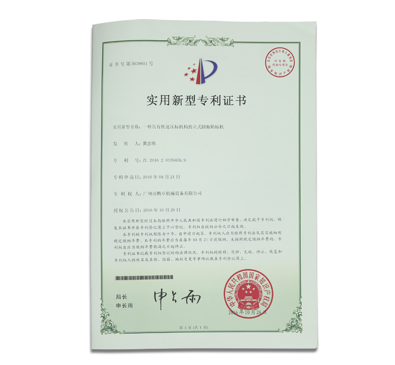 騰卓機械專利生產(chǎn)證書,專業(yè)制造包裝設備的生產(chǎn)廠家,全自動及半自動的洗瓶機,烘干機,灌裝機,旋蓋機,貼標機,套標機,打碼機等非標定制自動化包裝生產(chǎn)線